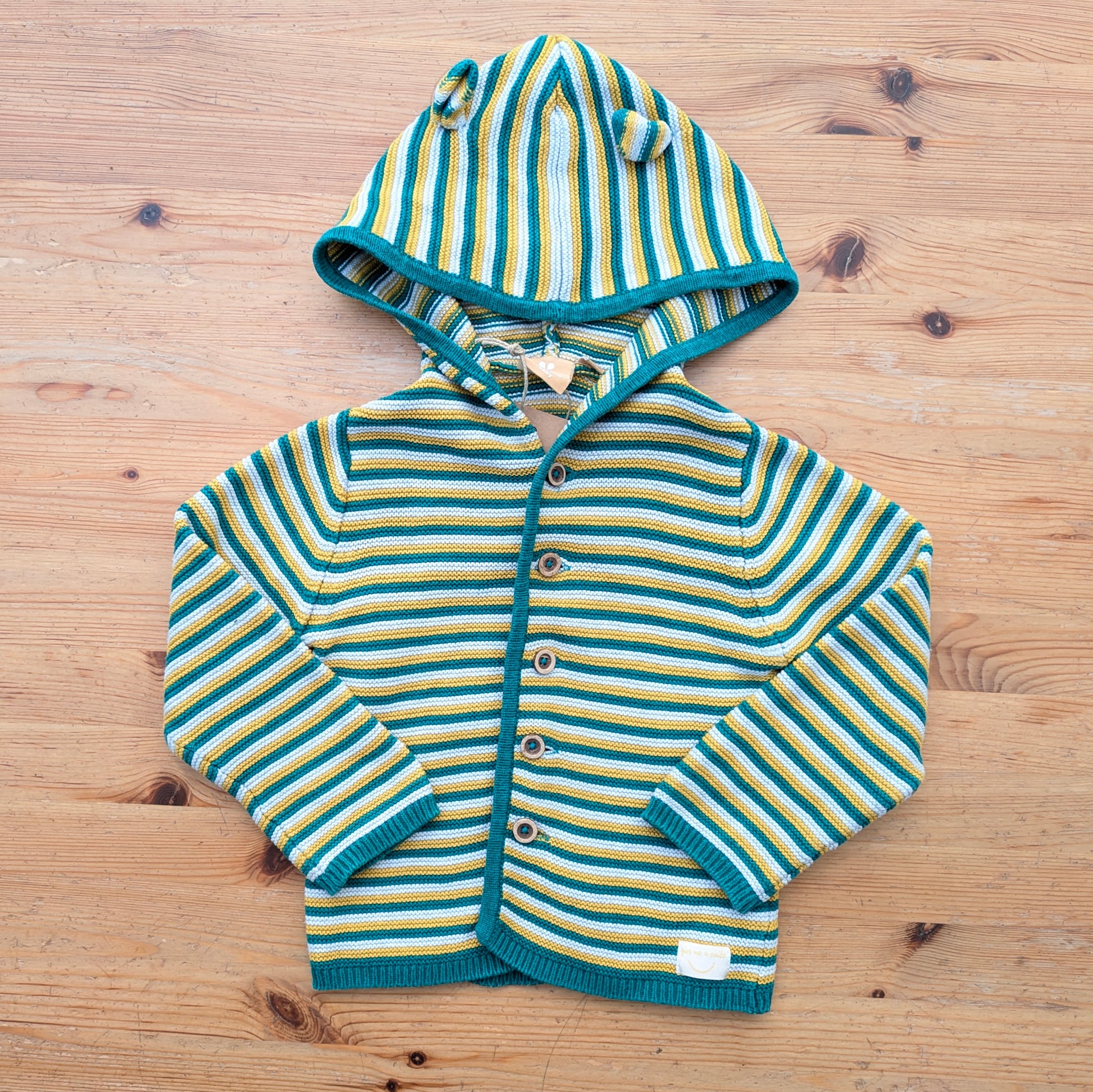 A striped cotton knit sweater with wooden buttons.